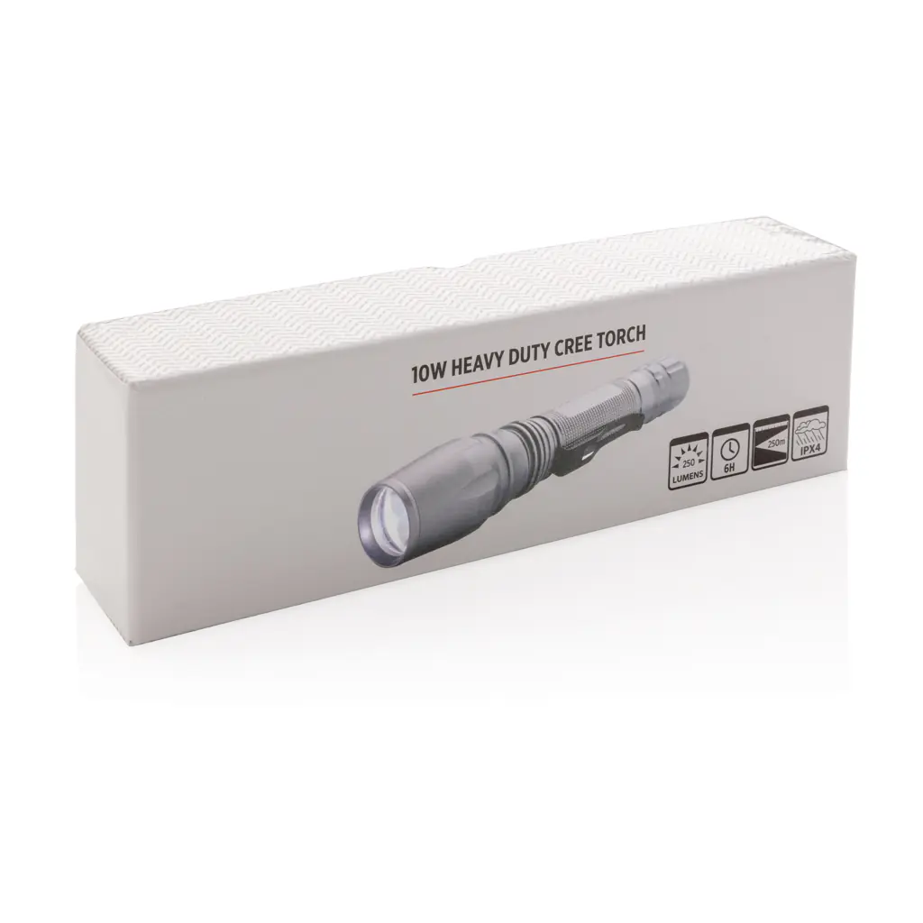 Super heldere en krachtige 10W CREE led-zaklamp die zelfs de moeilijkste omstandigheden aankan. De duurzame aluminium zaklamp is IPX 4 waterdicht en schokbestendig tot 1 meter. De lichtbundel van de zaklamp kan worden aangepast om te focussen of om een groter gebied te verlichten. Met riemclip voor het dragen van de zaklamp. 250 lumen en werktijd van 6 uur. Inclusief batterijen voor direct gebruik.Verpakt in geschenkverpakking.