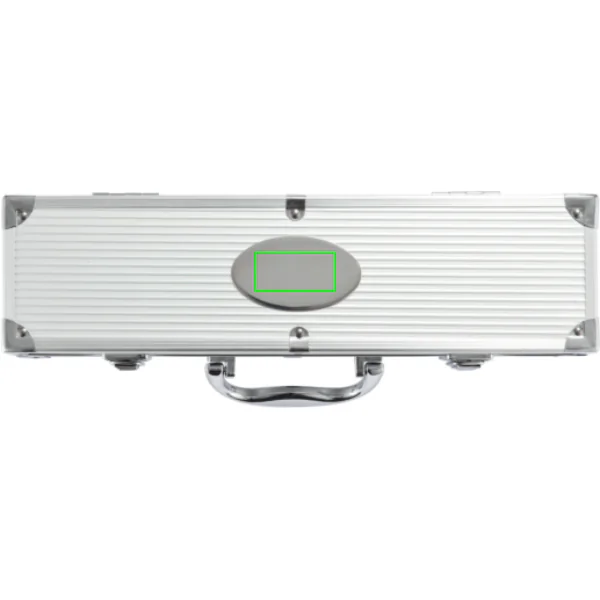3-delige roestvrijstalen set in aluminium koffer inclusief spatel, tang en vork.