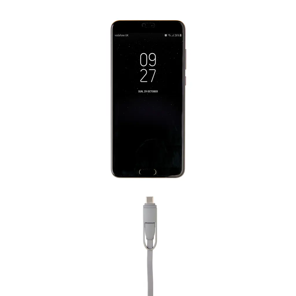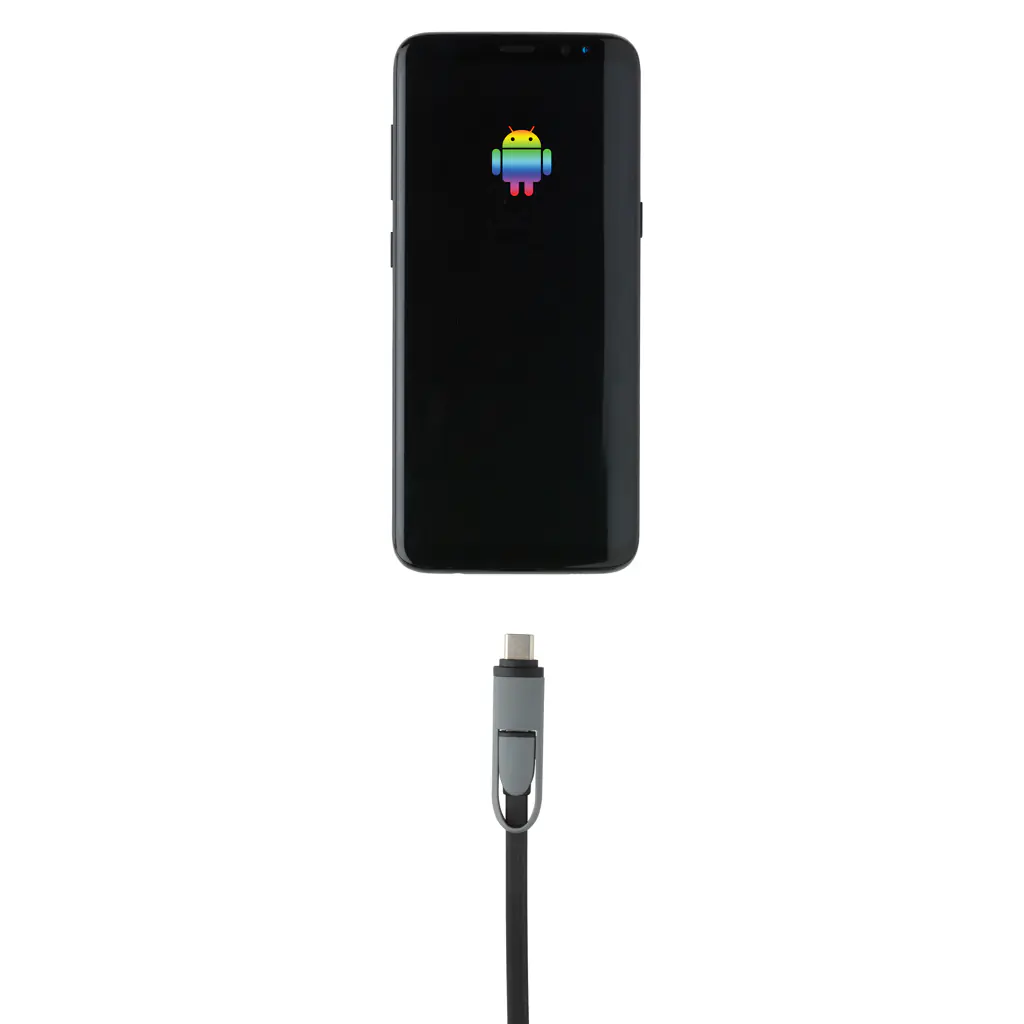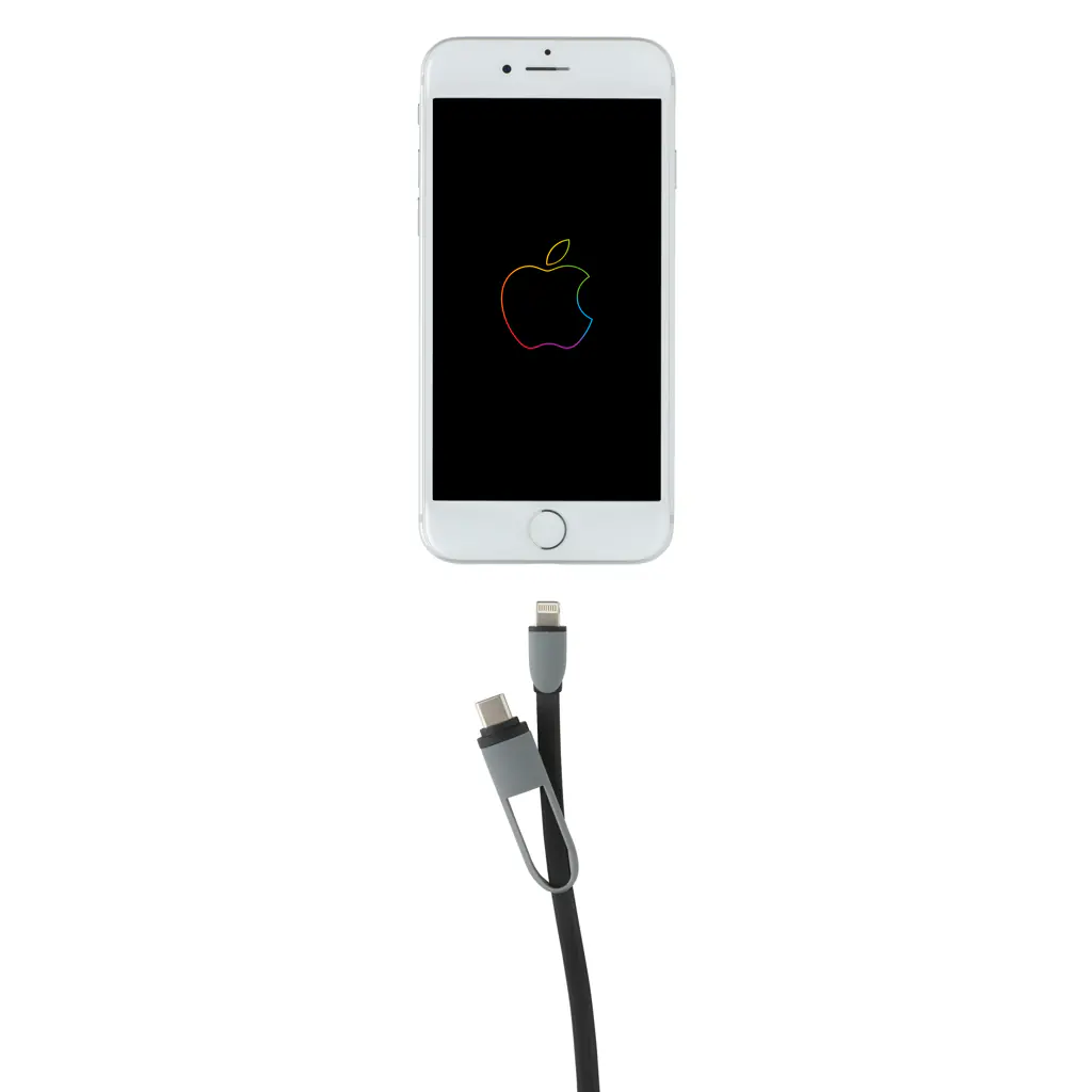 Compacte en oprolbare 3-in-1 oplaadkabel met type C en dubbelzijdige connector voor iOS- en Android-apparaten die micro-USB vereisen. Dankzij het rolmechanisme kan de 100 cm lange platte kabel gemakkelijk worden meegenomen zonder dat deze in de knoop raakt. ABS behuizing met TPU-kabel. Ook geschikt voor synchroniseren.