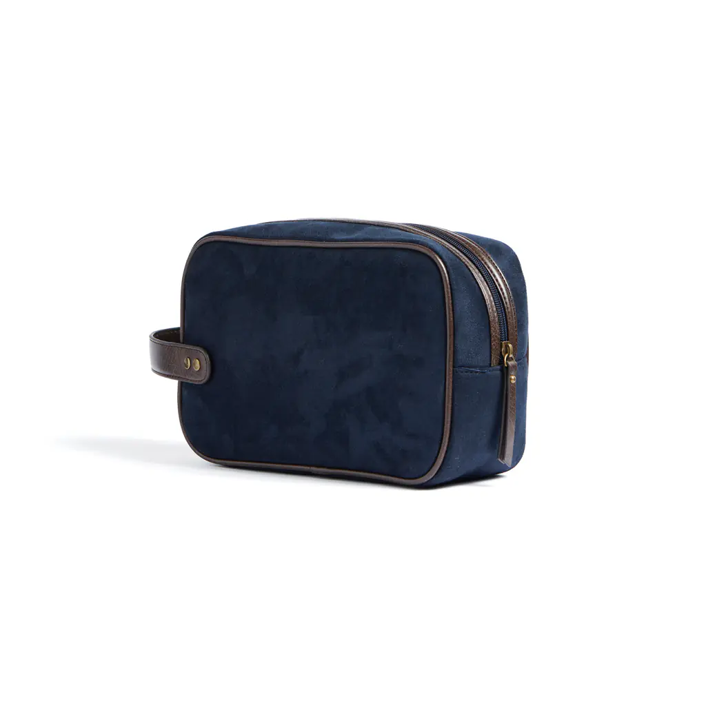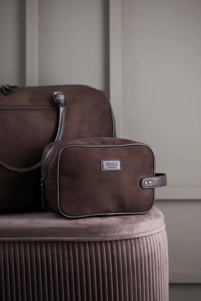Een klassieke en toch moderne toilettas gemaakt van suede-imitatieleer met details van PU-leer. De toilettas kunt u stijlvol vullen met toiletartikelen, zowel voor thuis als tijdens het reizen. De tas heeft een handig formaat en is gemakkelijk te dragen, dankzij een riempje, met messing details, aan de korte zijde.